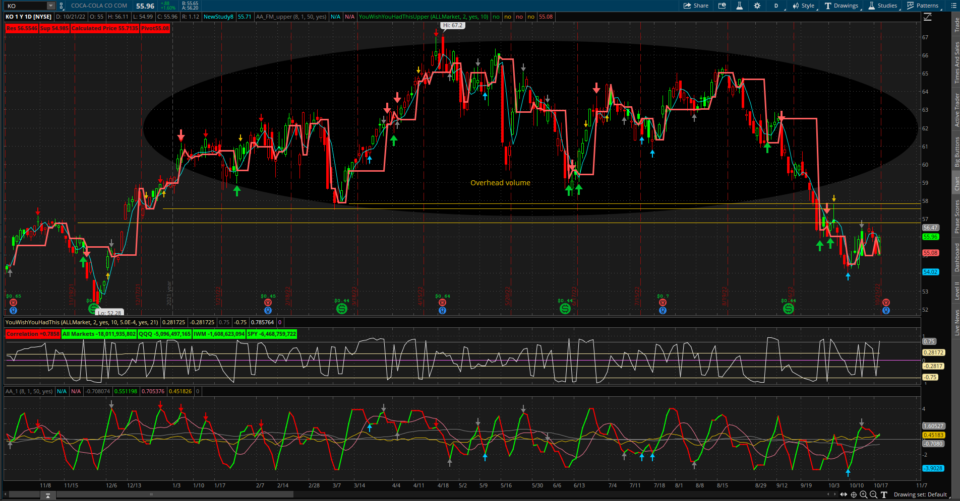 $Coca-Cola(KO)$ 56.80-57.55 even outside of tech you still see the same overall pattern a 2nd rejection in this pattern will definitely send the stocks lower than they have been so you could pick any stock that is looking like these and be able to tell if we get into a bull run bc you will see price action get into that overhead volume retest that bottom and move up but most likely it gets rejected thats a lot of volume that is trapped