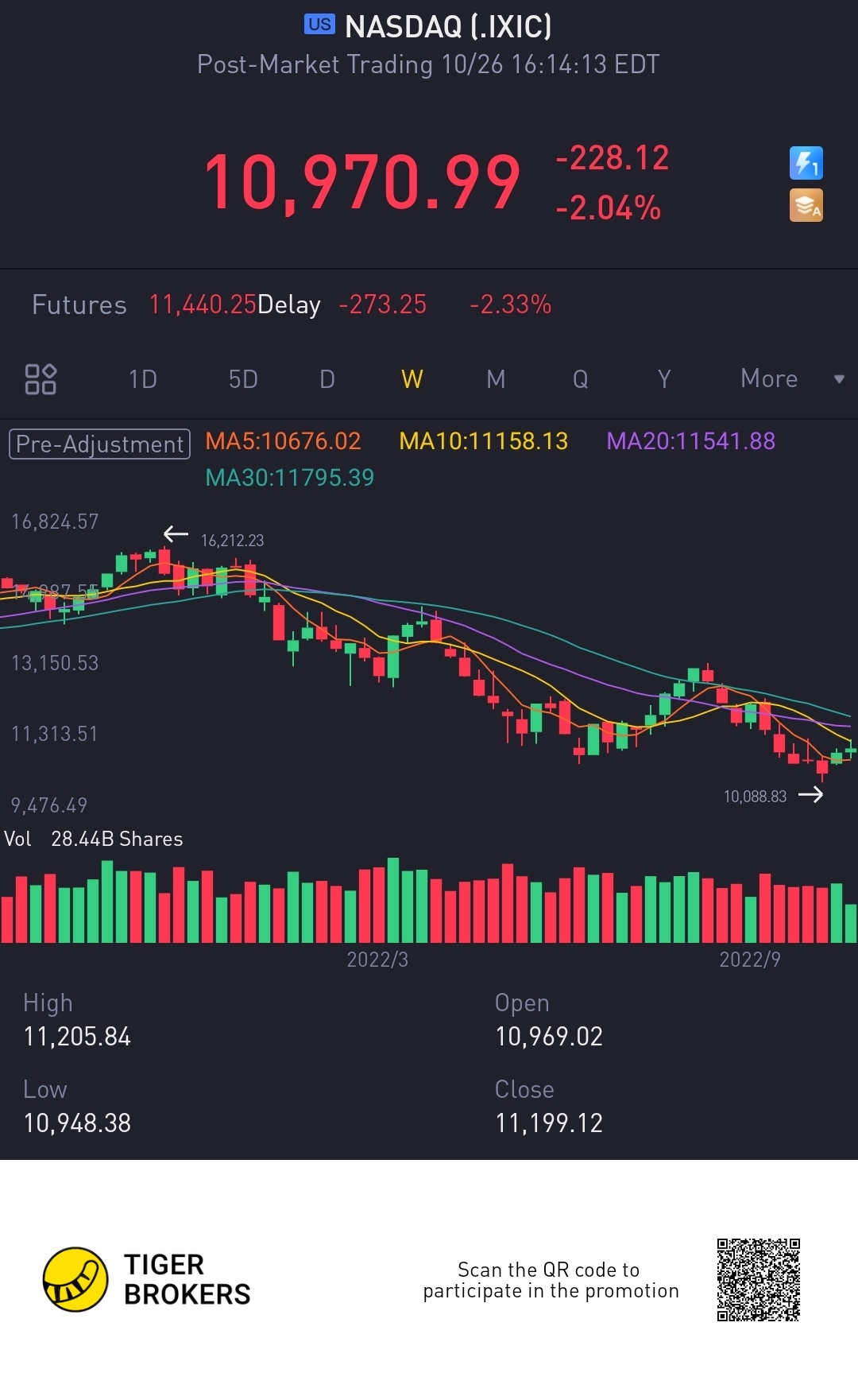 $NASDAQ(.IXIC)$the market tried to get rid of influence from $msft$ and $googl$, but failed. The index closed under weekly ma10, and its a week sign if there's no big turn tomorrow.