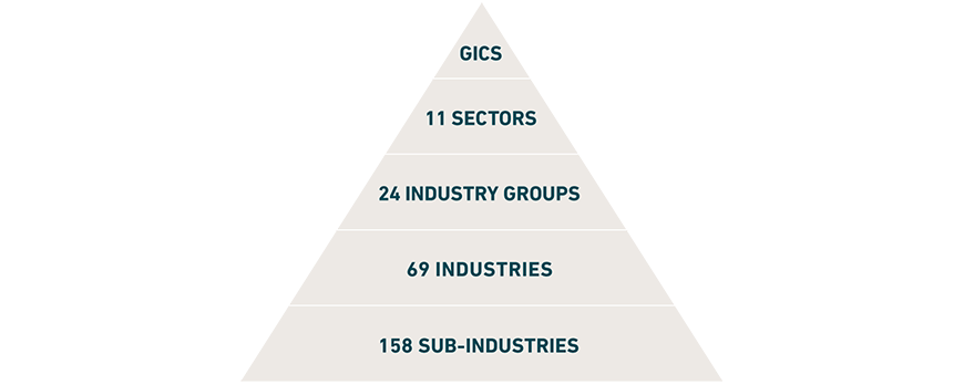 The GICS classification system has four levels:11 economic sectors, 24 industry groups, 69 industries and 156 sub-industries.You need only keep in mind these two important points about US stock classification: