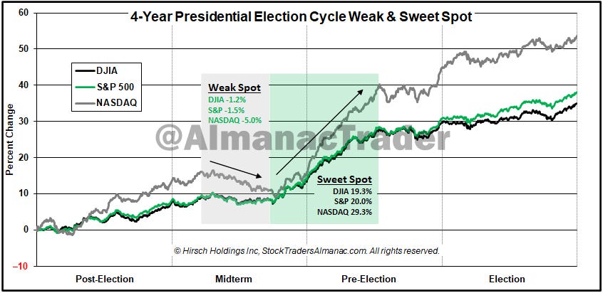 Worth noting that we are still in the middle of a seasonally sketchy part of the year (/election cycle) — fromStock Trader’s Almanac:"seasonal/cycle outlook is for a lower low or retest of the lows over the next three months as we are in the worst two months of the year and are smack dab in the *Weak Spot* of the 4-Year Cycle"