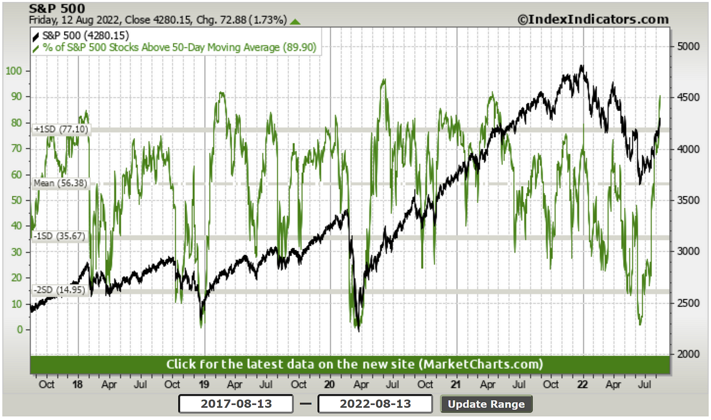 As of Friday, about 90% of the market is back above their respective 50dma (up ferociously from almost 0% back in mid-June).