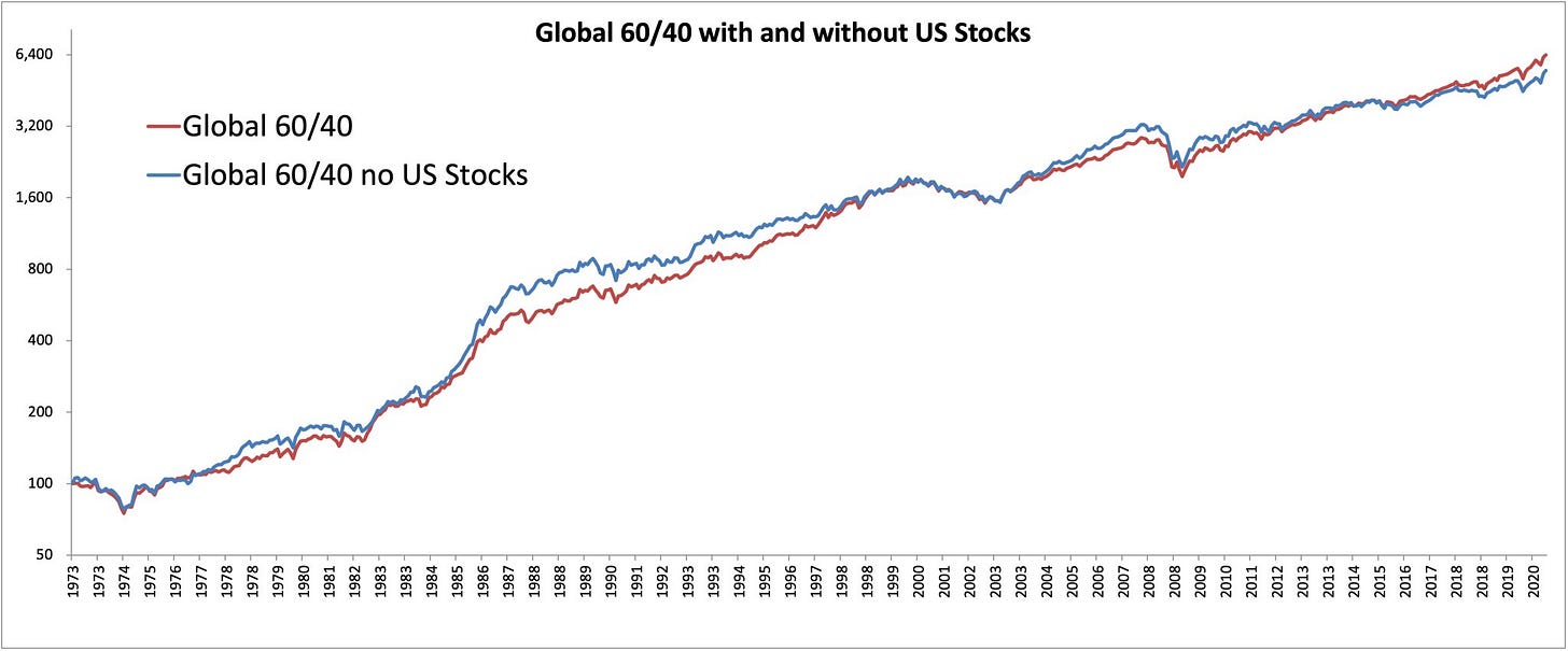 This interesting chart shows the path of a global 60/40 portfolio with vs without US stocks.