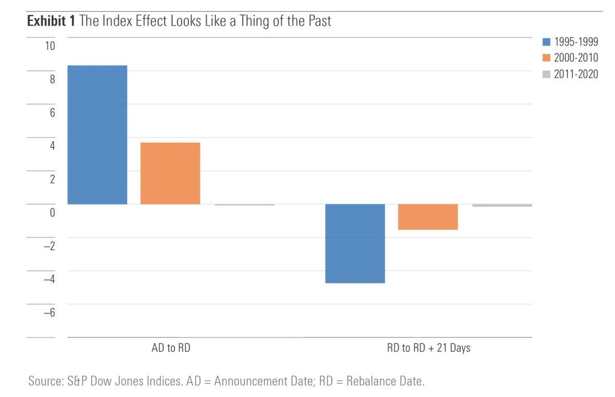 “the up-and-down trajectory that was once the fingerprint of the index inclusion effect now resembles a flat line that runs from announcement date through the weeks following inclusion in the S&P 500.“