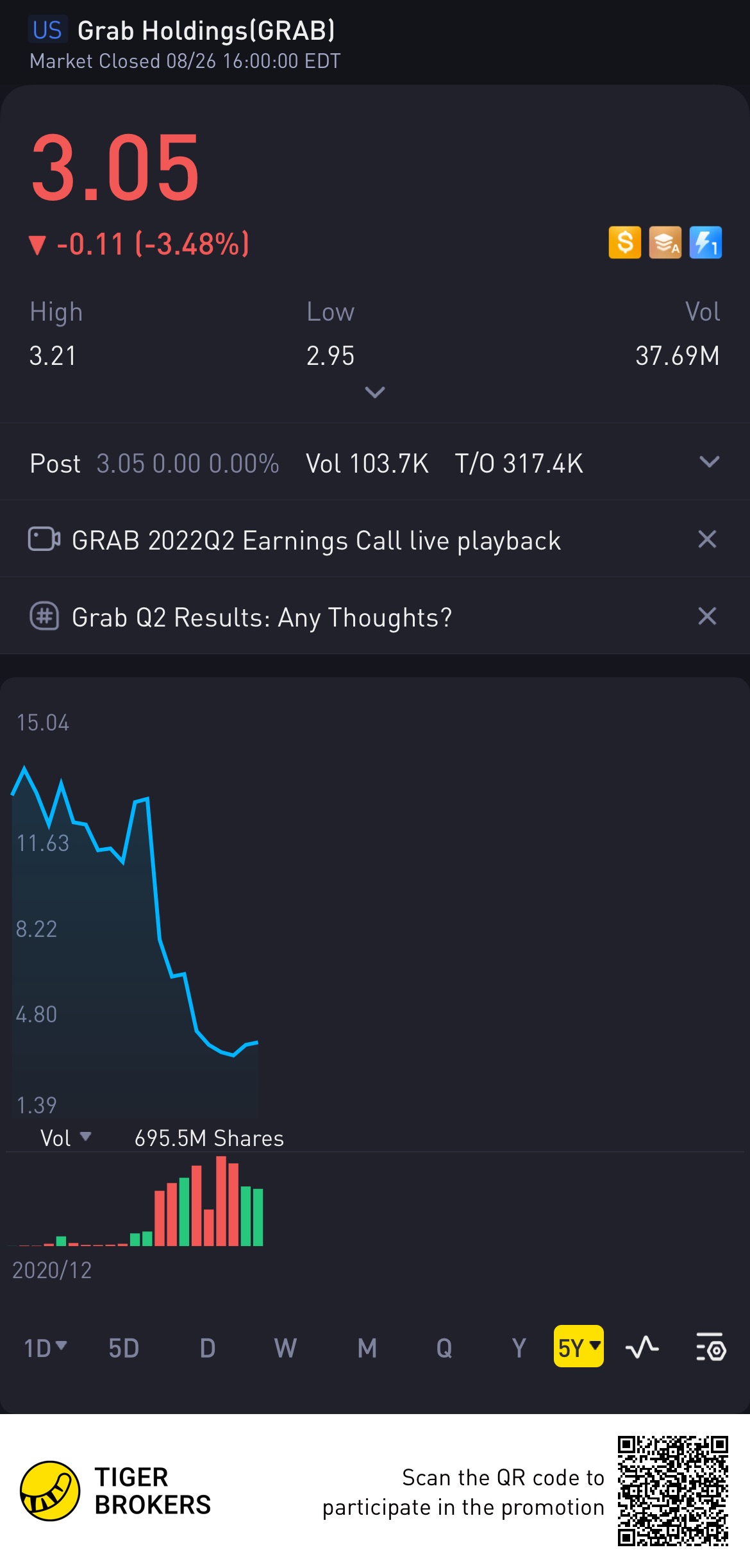 $Grab Holdings(GRAB)$In the short term market environment where unprofitable companies are severely punished, it's hard to be be bullish. High incentive payout & HQ cost remained a drag To earnings. Fintech future growth is a bright spot but need to grow much more before it can really impact. Short term bearish..