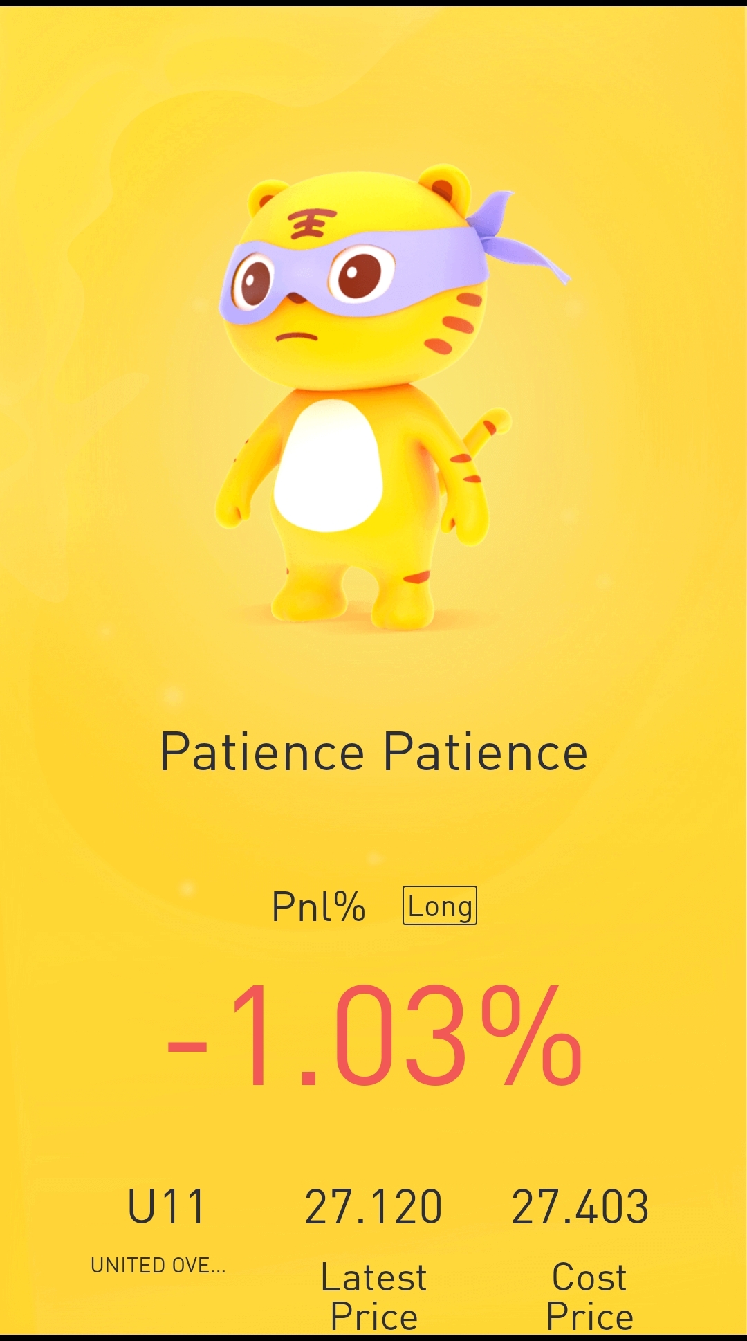 $UNITED OVERSEAS BANK LIMITED(U11.SI)$ UOB at this price is good for short term trading, when go below 27 can buy. Above 27 can sell for profit. If go further down to 26 plus can average down. If got stuck just hold on to it for dividend income. [Happy]