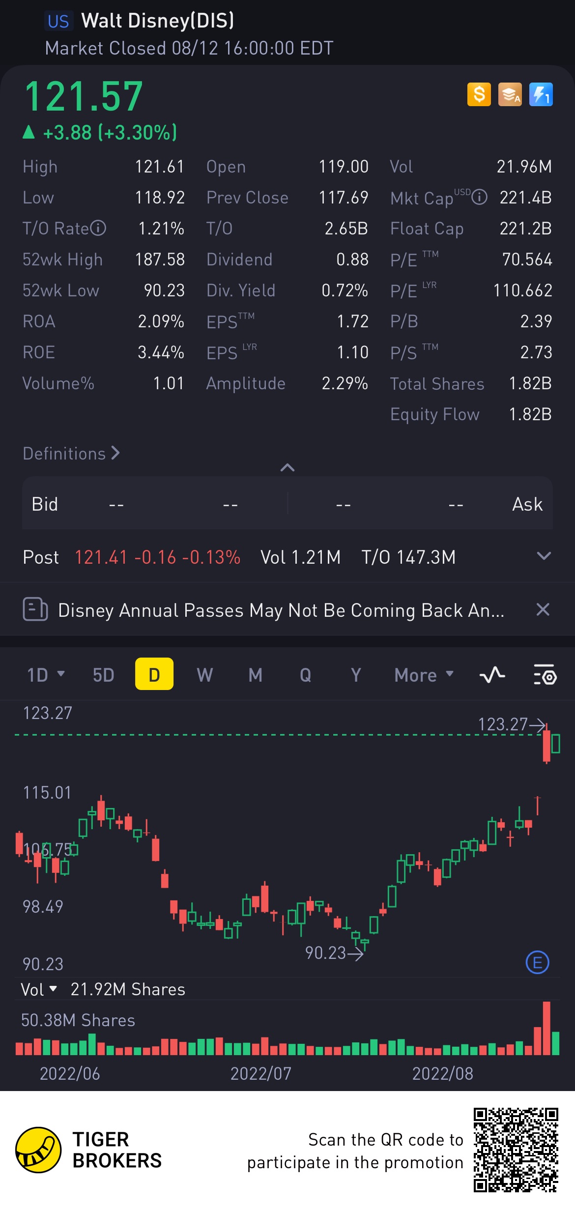 $Walt Disney(DIS)$ unless US shuts down due to monkeypox, I can't see Disney going anywhere but up over the next quarter. I don't think even a recession could beat it down.. could it? [Smug] [Thinking] [Doubt] [Helpless]