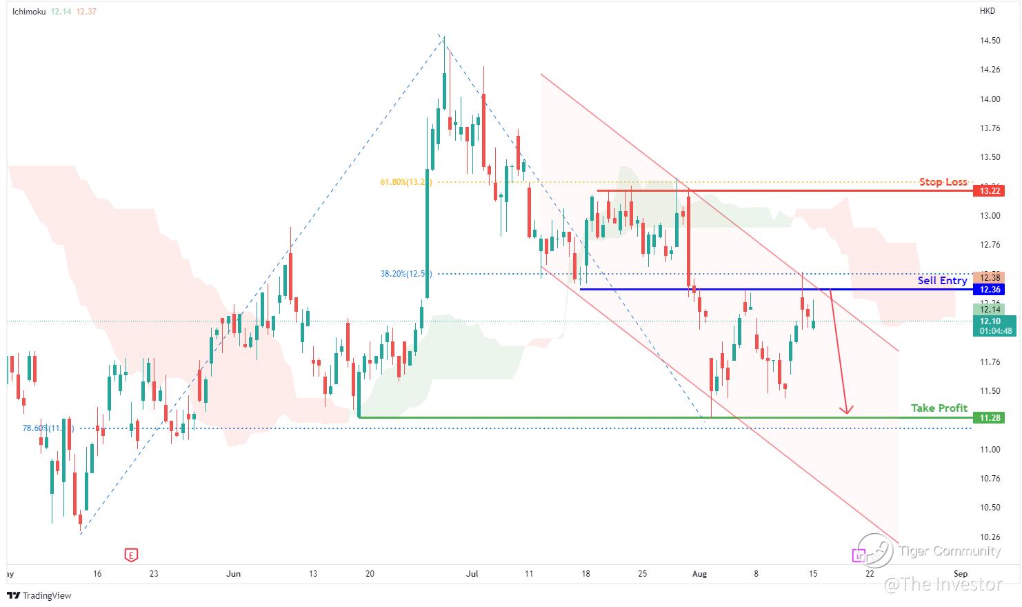 On the H4, with prices moving within the descending channel and below the ichimoku indicator, we have a bearish bias that price will drop from sell entry at 12.36 where the overlap resistance and 38.2% fibonacci retracement are to the take profit at 11.28 in line with swing low support and 78.6% fibonacci retracement. Alternatively, price could break entry structure and rise to stop loss at 13.22 where the swing high resistance and 61.8% fibonacci retracement are.