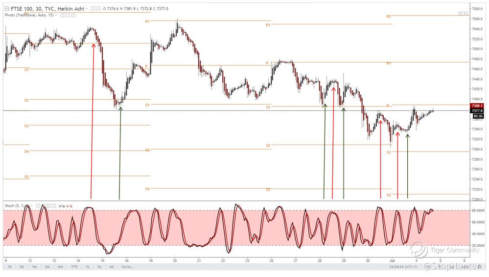 Example: OVER BOUGHT & OVER SOLD Intraday Pivots + Stochastic : FTSE 100 30 min chart