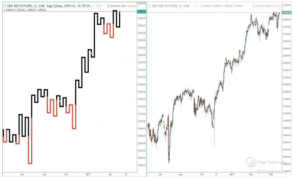 The Kagi Chart – No time only price : Kagi S&P 500 chart versus the traditional candlestick chart S&P 500 chart. (Charts: TradingView)