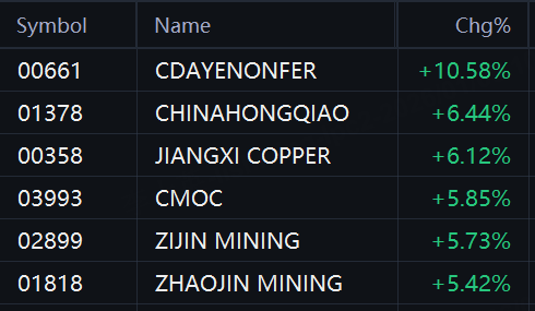 Nonferrous metal stocks jumped in Hong Kong. China Daye rose 11%; China Hongqiao, Jiangxi Copper, CMOC, and Zijin Mining rose 6%; Zhaojin Mining rose 5%.