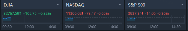 U.S. stocks mixed in morning trading; DJIA rose 0.32%, S&P 500 slid 0.36% while NASDAQ fell 0.65%.