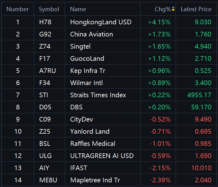 Singapore stocks opened higher on day. STI rose 0.22%; HongkongLand up over 4%; China Aviation, Singtel, GuocoLand, Kep Infrs Tr up around 1%; Mapletree Ind Tr, iFast down over 2%.