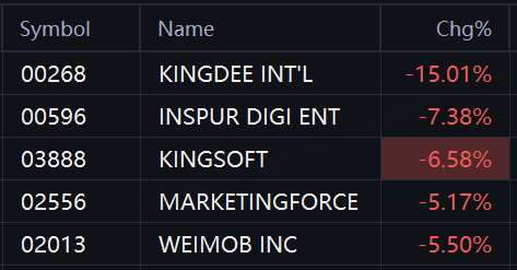 Software stocks sank in Hong Kong, with some investors pointing to a recently updated artificial intelligence chatbot by Anthropic as the main culprit. Kingdee International fell 15%; Inspur Digital Enterprise and Kingsoft fell 7%; Weimob fell 6%; Marketingforce fell 5%.