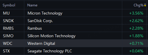 Micron up 4%; SanDisk up 3%; Rambus, Silicon Motion up 2%; Western Digital up 1%.