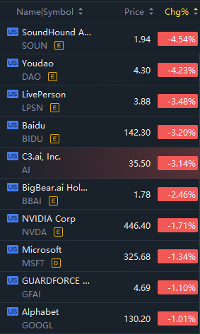 AI and semiconductor stocks were dragged down in morning trading after Palantir’s news; SoundHound AI Inc and Youdao fell over 4%.