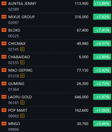 HK New Consumption Shares Rally. Auntea Jenny up 13%; Mixue Group up 8%; Bloks and ChicMax up 7%; Chabaidao up 4%; Maogeping up over 3%.