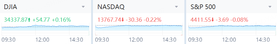 The Dow Jones Industrial Average rose 54.77 points, or 0.16%, to 34,337.87, the S&P 500 fell 3.69 points, or 0.08%, to 4,411.55 and the Nasdaq Composite fell 30.36 points, or 0.22%, to 13,767.74.