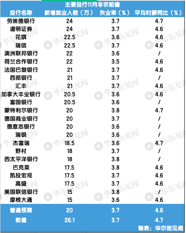 23家大型投行发布的最新非农前瞻报告显示,11月非农就业增长将进一步下滑,但投行之间的增幅预期差异较大。美国11月非农新增就业人数预计介于15万-24万,失业率预计介于3.5%-3.8%,平均时薪同比增速预计介于4.6%-4.7%。