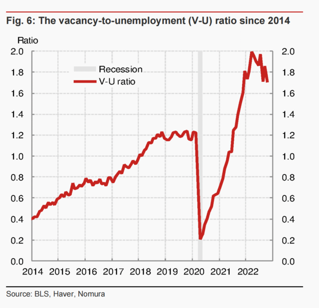 总的来看,野村指出,尽管招聘和离职速度放缓,劳动力市场仍然紧张,空缺与失业率(VU)从9月的1.86略微下降至10月的1.71,但仍远高于疫情前的水平。
