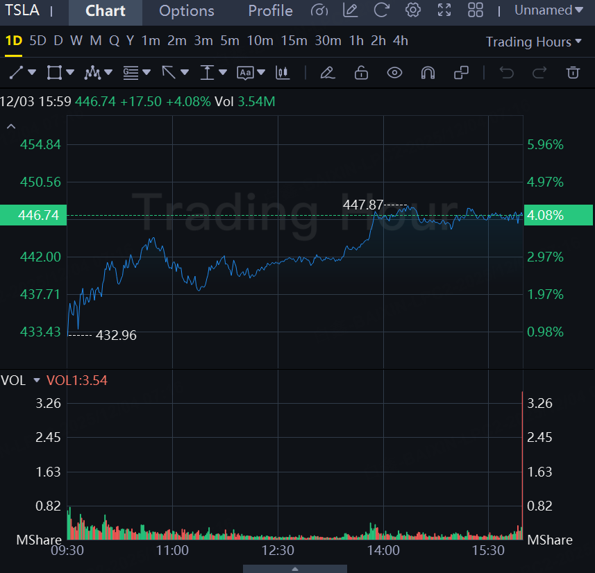 Shares of the electric-vehicle maker gained 4.1% on Wednesday, closing at $446.4, while the S&P 500 and Dow Jones Industrial Average gained 0.3% and 0.9%, respectively.