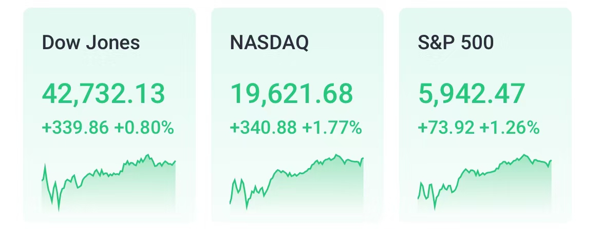 The Dow Jones Industrial Average rose 339.86 points, or 0.80%, to 42,732.13, the S&P 500 rose 73.92 points, or 1.26%, to 5,942.47 and the Nasdaq Composite rose 340.88 points, or 1.77%, to 19,621.68.