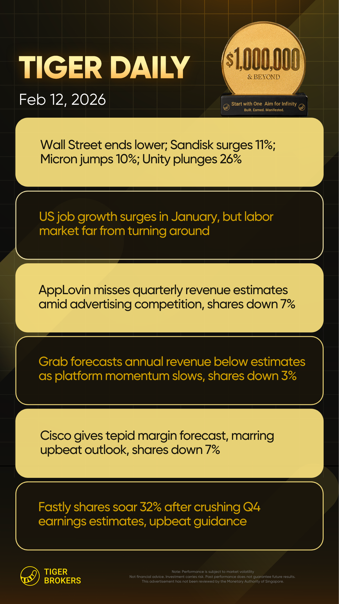 As of Feb 12, the U.S. major indexes closed as follows:The U.S. major indexes closed as follows: Dow Jones down 0.13% at 50,121.40; S&P 500 down 0.00% at 6,941.47; NASDAQ down 0.16% at 23,066.47. The session featured mixed moves: strength across select semiconductors contrasted with softness in some mega-cap tech names. Investors digested a heavier earnings slate and AI infrastructure headlines, while pockets of software underperformed. Overall breadth was balanced, with resilient hardware names offsetting declines in several growth software and crypto-linked equities. Unusual-move stocks: Elevated movers were concentrated in chips and software. MU up 9.94% at $410.34; TSM up 3.37% at $374.09; NVDA up 0.80% at $190.05; AMD up 0.00% at $213.58; INTC up 2.46% at $48.29; SOXL up 7.44% at $68.05; SNDK up 10.65% at $599.34; STX up 2.78% at $407.25; U down 26.32% at $21.41; MSFT down 2.15% at $404.37; GOOG down 2.29% at $311.33; GOOGL down 2.39% at $310.96; AMZN down 1.39% at $204.08; AAPL up 0.67% at $275.50; PLTR down 2.75% at $135.68; COIN down 5.73% at $153.20; SLV up 4.29% at $76.56; SHOP down 6.70% at $118.71; NFLX down 3.15% at $79.62. Chip leadership and AI infrastructure themes supported semis, while software skews weighed on growth cohorts. Memory and foundry names such as MU and TSM advanced amid robust AI supply-chain signals, even as mega-cap platforms like MSFT, GOOG, and GOOGL declined. The sharp drop in U followed softer guidance, and crypto-exposed COIN moved lower alongside digital-asset volatility. Meanwhile, strength in SLV pointed to renewed interest in precious metals proxies, and selective gains in AAPL and NVDA helped cushion broader tech weakness.