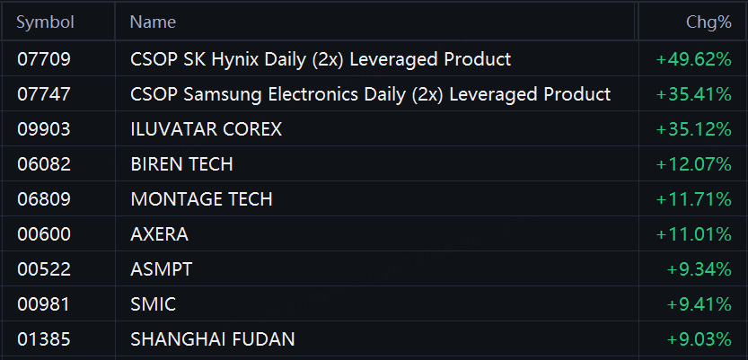 Chip stocks jumped in Hong Kong. CSOP SK Hynix Daily (2x) Leveraged Product rose 50%; CSOP Samsung Electronics Daily (2x) Leveraged Product and Iluvatar CoreX rose 35%; Hua Hong Semi rose 15%; Biren Tech and Montage Tech rose 12%; AXERA rose 11%; ASMPT, SMIC, and Shanghai Fudan rose 9%.