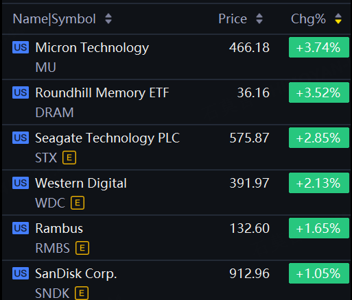 Storage shares jumped. Micron up nearly 4%; Seagate Tech up about 3%; Western Digital up over 2%; SanDisk up 1%.