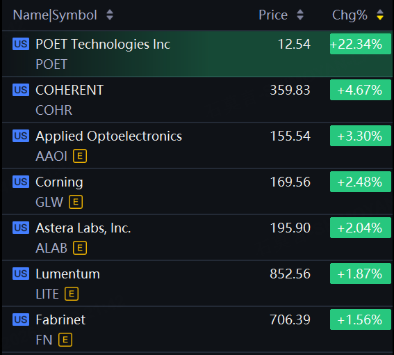 Optical communication stocks jumped on Wednesday. POET Technologies up 22%; Coherent up over 4%; AAOI up over 3%.