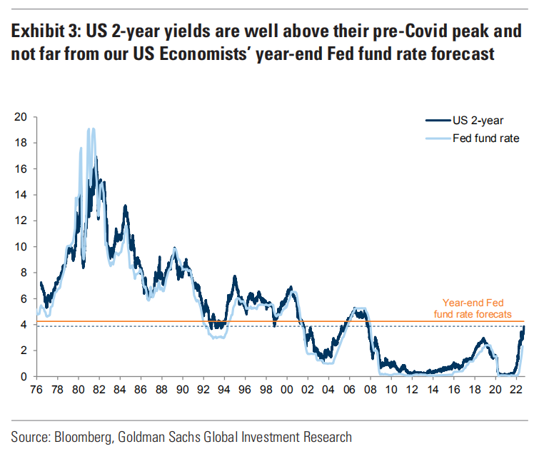 因此,高盛认为,美国2年期国债收益率见顶将是鹰派政策见顶的一个关键信号,并在一定程度上缓解各种资产的压力。