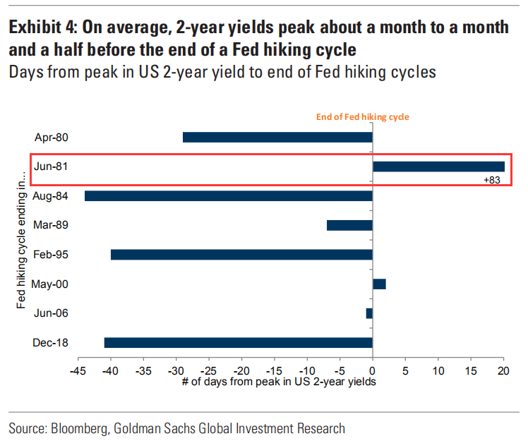 更有趣的是,2年期美债收益率通常如果不是在联邦基金利率之前见顶(在之前一个月到一个半月之间),就是几乎同时见顶。1981年的紧缩周期是这一趋势的唯一主要例外,但在那个时期,美联储在加息和降息之间摇摆不定,与两位数的通胀反复作斗争,这导致利率在更长时间内保持高位。