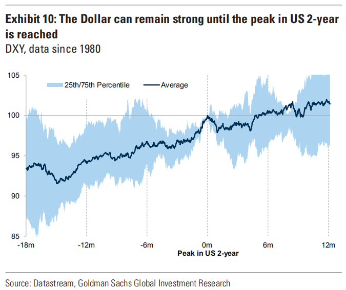 在2年期美债收益率达到峰值之前,美元往往处于强势地位,这与我们的外汇策略师对未来美元将进一步走强的预期一致,但之后美元普遍走弱,波动更大。
