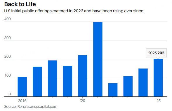 After a lackluster 2024, initial public offerings roared back to life in 2025. IPO research and investment manager Renaissance Capital says 202 companies priced IPOs in 2025, a 35% increase from 2024, raising some $44 billion, up almost 50% from 2024. And that came in the face of tariff-related volatility and a government shutdown.
