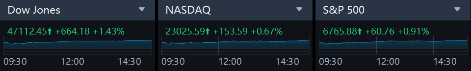 The Dow Jones Industrial Average rose 664.18 points, or 1.43%, to 47,112.45, the S&P 500 gained 60.77 points, or 0.91%, to 6,765.89 and the Nasdaq Composite gained 153.59 points, or 0.67%, to 23,025.59.