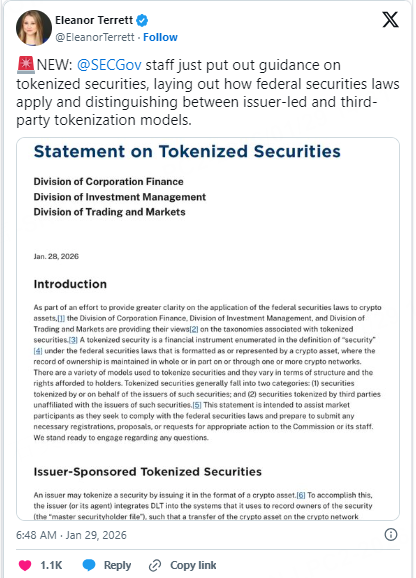 As a result, such assets carry the same registration, disclosure, and compliance obligations as traditional securities. The move is part of the SEC’s broader effort to establish a clearer token taxonomy as lawmakers work on a crypto market structure framework, reinforcing the long-held view that “tokenized securities are still securities.”