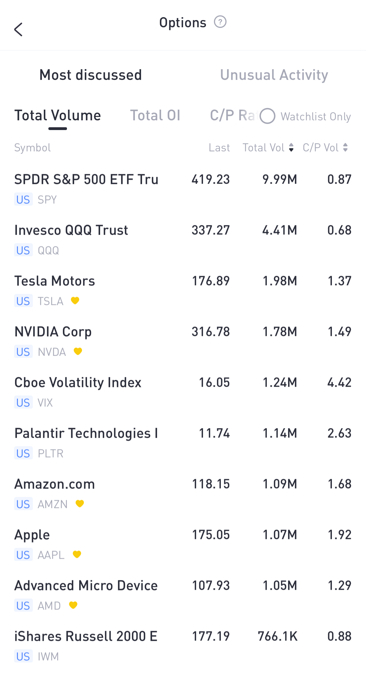 Top 10: SPY; QQQ; Tesla; NVIDIA; VIX; PLTR; AMZN; AAPL; AMD; IWM