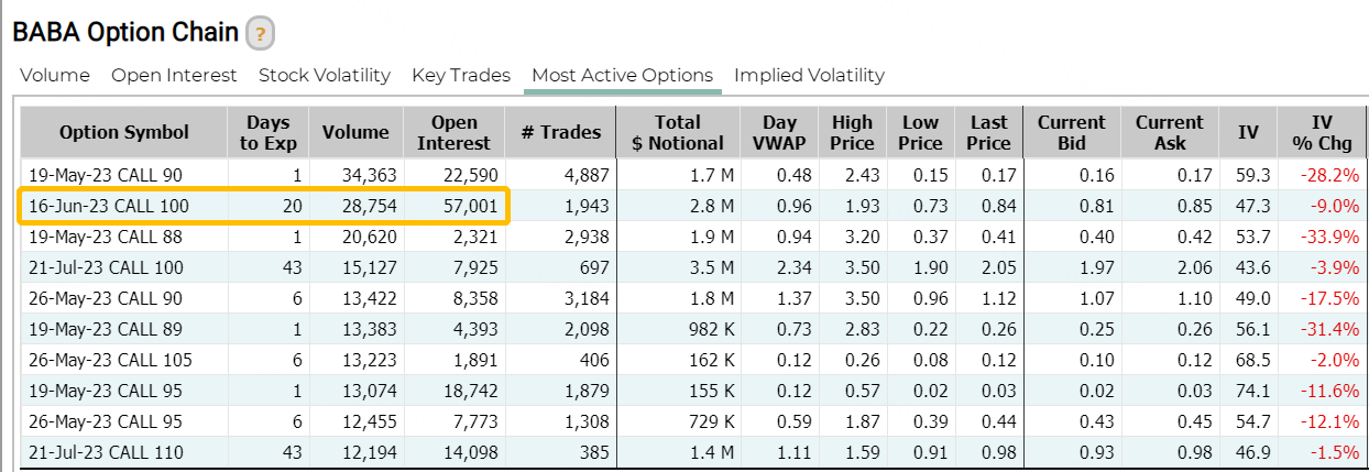 A particular high open interest was seen for the 100 strike call option expiring June 16, with 57,001 open interest as of Thursday.