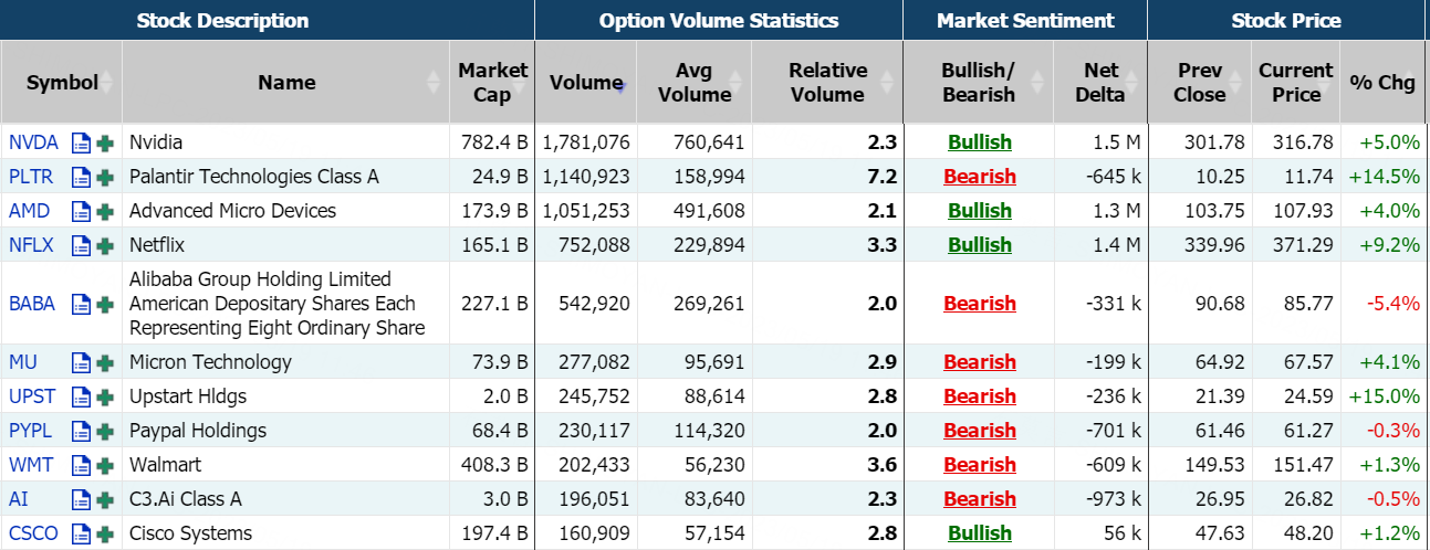 This report shows stocks with the highest volume of bullish and bearish activity by option delta volume, which converts option volume to an equivalent stock volume (bought or sold).