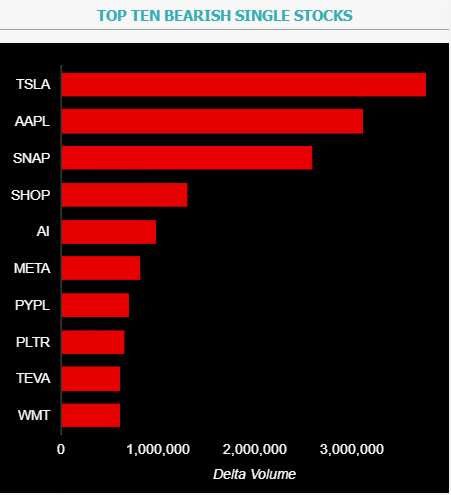 Top 10 bearish stocks: TSLA; AAPL; SNAP; SHOP; AI; META; PYPL; PLTR; TEVA; WMT