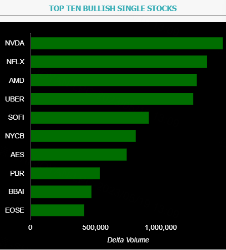 Top 10 bullish stocks: NVDA; NFLX; AMD; UBER; SOFI; NYCB; AES; PBR; BBAI; EOSE