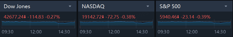 The Dow Jones Industrial Average fell 114.83 points, or 0.27%, to 42,677.24, the S&P 500 lost 23.14 points, or 0.39%, to 5,940.46 and the Nasdaq Composite lost 72.75 points, or 0.38%, to 19,142.72.