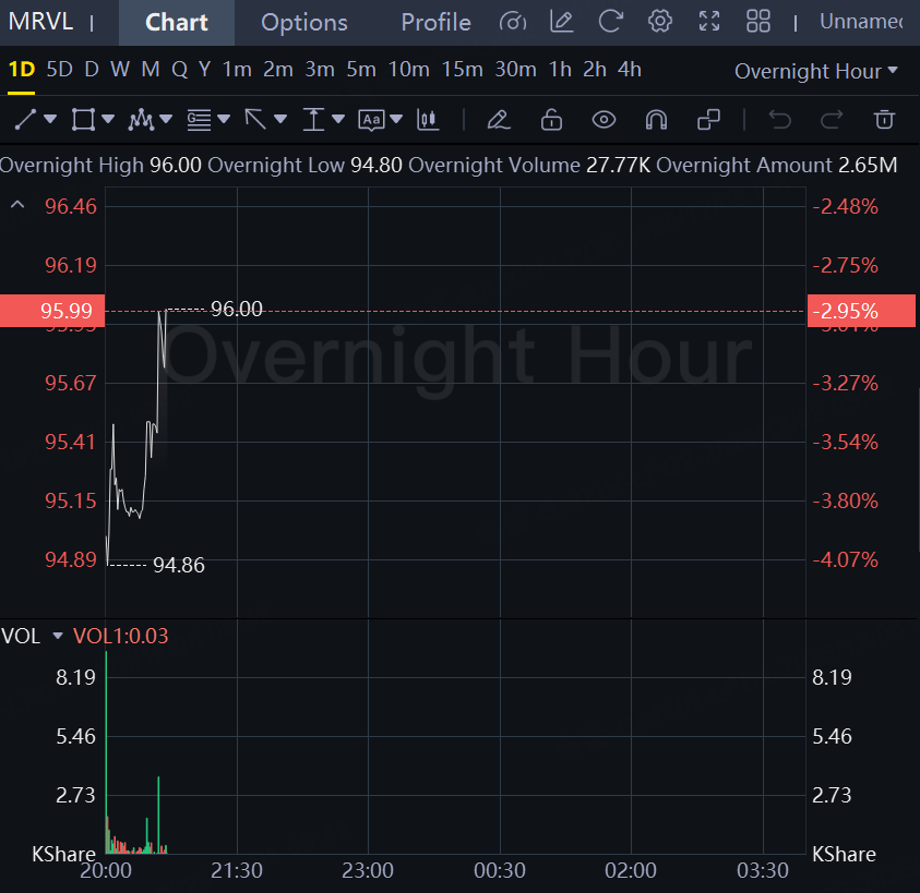 Marvell fell 3% in overnight trading after Microsoft is in talks to shift its custom chip business to Broadcom from Marvell.