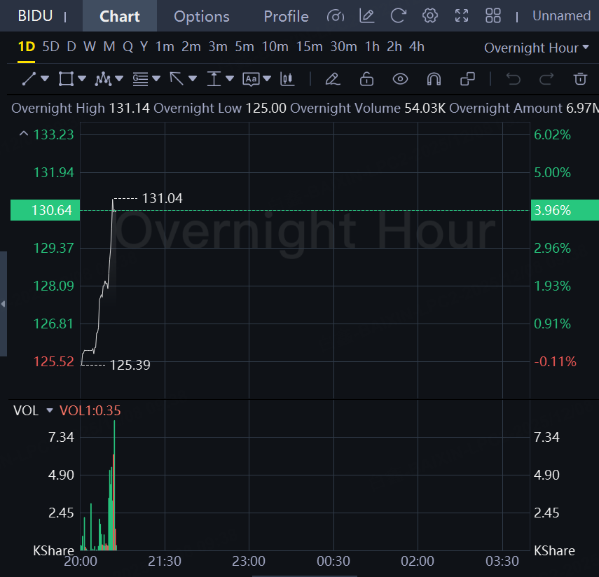 Baidu rose 4% in overnight trading as it assesses spin-off and listing of cip unit Kunlunxin.