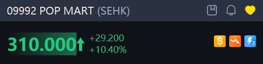 Chinese plush toymaker Pop Mart shares surged 10.4% in Hong Kong to HK$310, pushing its market capitalization above HK$415 billion and setting a new record high.