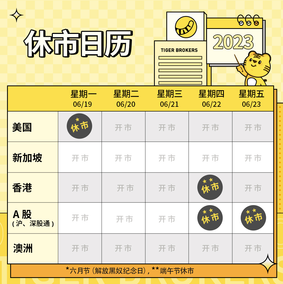 摘要:6月19日是美国的联邦假日(六月节),美股将于当日休市;中国传统节日端午节假期临近,A股、港股将于6月22日休市。