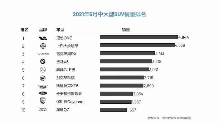 而同日,理想汽车也发布了两份销量榜单,其中,在5月新能源SUV(包含纯电动、增程式电动、插电式混合动力车型)销量排名中,理想ONE获第二名,仅次于特斯拉Model Y(参数|图片);而在5月中大型SUV销量榜单中,则超越上汽大众