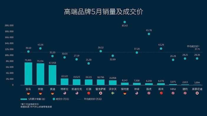 近日,一张主题为“高端品牌5月销量及成交价”的数据统计图在网络流传。该图囊括了德系、美系、日系、自主系等国内市场主流豪华品牌,统计了各品牌的5月销量以及平均售价并以前者高低进行排名。值得一提的是,一汽红旗以及蔚来是唯二两个被列入排名的中国品牌。
