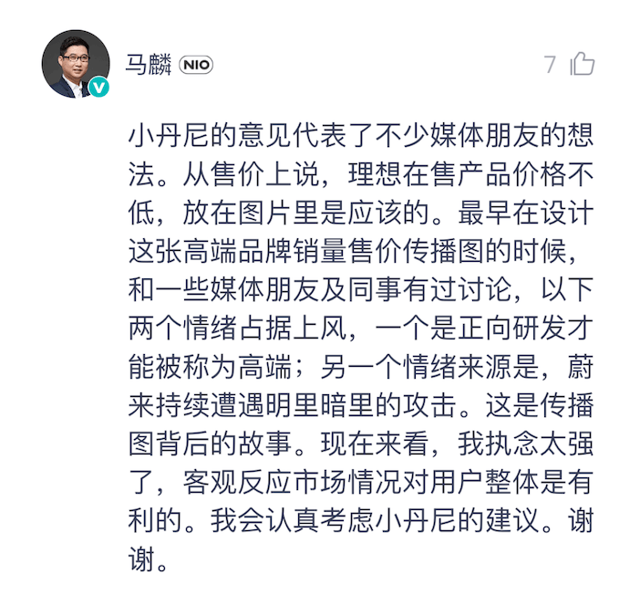 该帖随后获认证为蔚来企业传播高级总监兼公关总监马麟的回应:“从售价上说,理想在售产品价格不低,放在图片里是应该的。最早在设计这张高端品牌销量售价传播图的时候,和一些媒体朋友及同事有过讨论,以下两个情绪占据上风,一个是正向研发才能被称为高端;另一个情绪来源是,蔚来持续遭遇明里暗里的攻击。这是传播图背后的故事。”