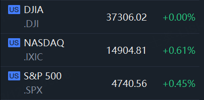 The Dow Jones Industrial Average held steady at 37,306.02, the S&P 500 gained 21.37 points, or 0.45%, to 4,740.56 and the Nasdaq Composite added 90.89 points, or 0.61%, to 14,904.81.