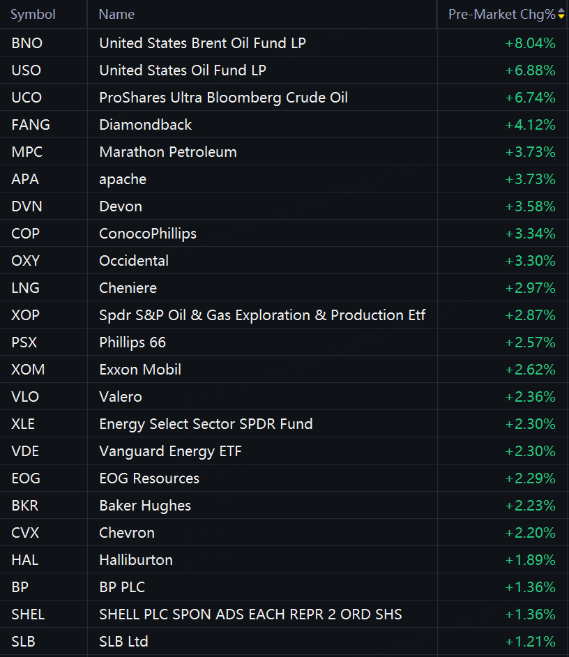 Oil stocks and ETFs jumped in premarket trading. United States Brent Oil Fund LP rose 8%; United States Oil Fund LP and ProShares Ultra Bloomberg Crude Oil rose 7%; Diamondback, Marathon Petroleum, Apache, and Devon rose 4%; ConocoPhillips, Occidental, Cheniere, Spdr S&P Oil & Gas Exploration & Production ETF, Exxon Mobil, and Phillips 66 rose 3%; Valero, Energy Select Sector SPDR Fund, Vanguard Energy ETF, EOG Resources, Baker Hughes, Chevron, and Halliburton rose 2%; BP, Shell, and SLB rose 1%.